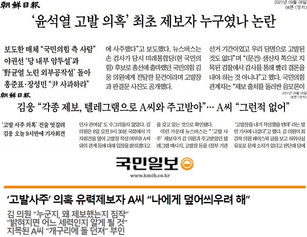 국민일보는 "대선 정국을 뒤흔들고 있는 ‘검찰 고발 사주’ 의혹의 제보자는 지난해 4·15 총선 당시 미래통합당(현 국민의힘) 선거대책위원회에 있던 A 씨가 유력한 것으로 전해졌다"고 보도했다.