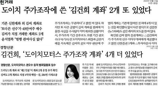 한편, 한겨레는 23일 기사 <결백 증거로 공개한 신한계좌, 시세조종 정황 고스란히>에서 "검찰이 윤석열 국민의힘 대선 후보 부인 김건희 씨 명의의 신한금융투자 계좌가 시세조종에 활용됐다고 판단한 거래의 세부 수법 등은 지난해 10월 윤 후보 쪽이 스스로 공개한 김 씨의 계좌 거래 내역을 통해서도 가늠할 수 있다"고 보도했다.
