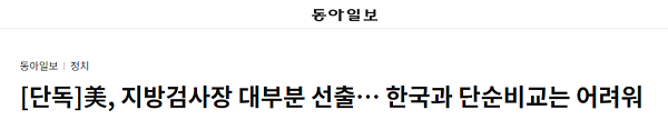 이어 동아일보는 “이들은 검사로 활동한 뒤 대부분 의회에 진출하거나 주지사 등을 거쳐 내각에 발탁된다”며 “즉, 정치인 자질이나 행정 능력을 검증받는 과정이 있다. 한국에서 검사로 활동하다가 바로 다른 정부 기관에 발탁되는 것과는 다르다”고 썼다.