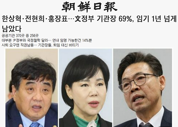 조선일보는 9일 기사 <한상혁·전현희·홍장표…文정부 기관장 69%, 임기 1년 넘게 남았다>에서 공공기관 370곳 중 기관장 임기가 1년 이상 남아있는 곳이 256곳에 달한다며 "새 정부가 올 연말까지 임명할 수 있는 공공기관장이 전체의 14.3%에 불과하다"고 전했다.