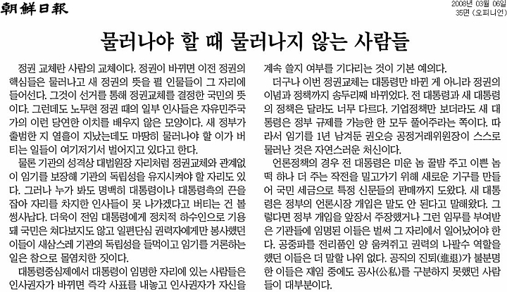 그러나 이명박 정부 시절 조선일보의 논조는 달랐다. 2008년 3월 6일 조선일보는 사설 <물러나야 할 때 물러나지 않는 사람들>에서 "정권 교체란 사람의 교체이다. (중략)그것이 선거를 통해 정권교체를 결정한 국민의 뜻"이라며 "그런데도 노무현 정권 때의 일부 인사들은 자유민주국가의 이런 당연한 이치를 배우지 않은 모양"이라고 썼다.