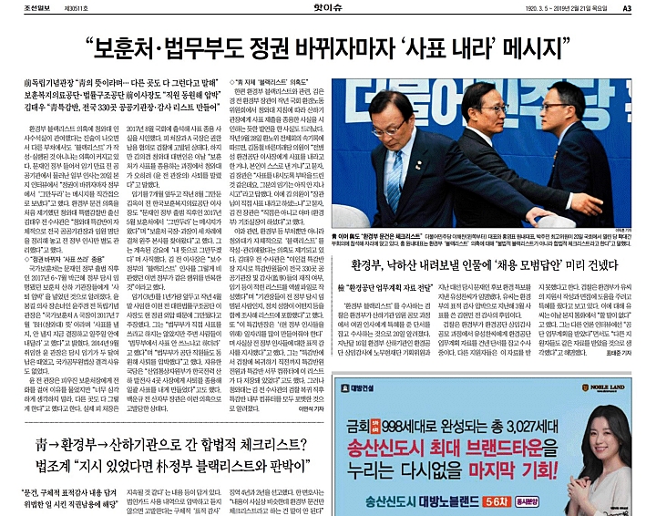 2019년 2월 18일 사설 <사실로 드러난 환경부 블랙리스트, 다른 부처도 다 밝혀질 것>에서는 "검찰 수사에서 환경부가 전(前) 정권 시절 임명된 산하기관 임원들을 쫓아내려고 표적 감사를 했음을 보여주는 문건들이 나왔다고 한다"며 "블랙리스트 문제로 많은 사람이 감옥에 가 있다. 현 정권 책임자들도 당연히 감옥에 가야 한다. 다음 정권 때가 아니라 지금 감옥에 가야 법이고 정의"라고 했다.