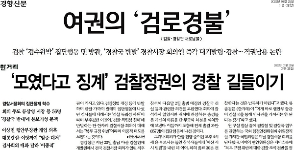 25일 경향신문은 1면 기사로 <여권의 '검로경불'>이라는 제목의 기사를 배치했다. 경향신문은 사설 <초유의 총경회의가 촉구한 경찰 중립, 정부는 수용해야>에서 "경찰의 중추를 이루는 대다수 간부들이 토의한 후 내놓은 의견인 만큼 가벼이 볼 일은 아니다. 그런데 경찰 지휘부는 이런 의견을 무시하는 것은 물론, 강압적으로 누르려 하고 있다"며 "지휘부의 이런 대응 자체가 경찰 독립성이 이미 무력화된 증거로, 행안부가 경찰 통제 명목으로 인사권 등을 장악해서는 안 된다는 사실을 방증하고 있다고 해도 과언이 아니다"고 지적했다.