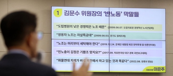 한편, 김 위원장은 12일 국회 환경노동위원회(환노위) 국정감사에 출석해 야당으로부터 과거 극우·노조혐오에 대한 사과를 요구받았으나 기존 입장을 고수했다. 김 위원장은 윤건영 민주당 의원이 반미·반일 민족의 수령(김일성)에게 충성을 하고 있다는 과거 발언에 대한 입장을 묻자 "그런 측면이 있다"고 답했다. 문재인 전 대통령을 향해서는 "확실한 김일성주의자"라고 말했다.