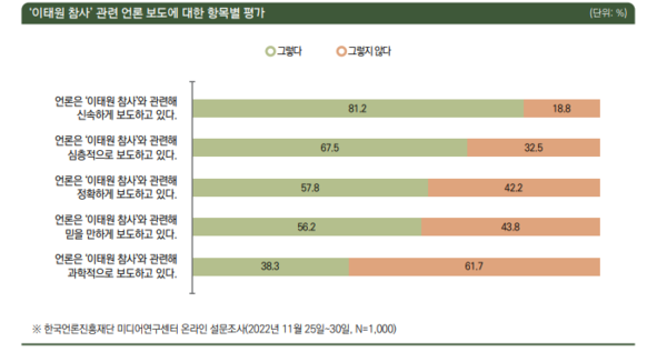 그 결과 응답자의 81.2%는 언론이 이태원 참사와 관련해 신속하게 보도하고 있다고 답했다. 심층적으로 보도하고 있다는 67.5%, 정확하게 보도하고 있다 57.8%, 믿을 만하게 보도하고 있다 56.2%다. 반면 과학적으로 보도하고 있다는 38.3%로, 항목 중 유일하게 50%를 넘지 못했다.
