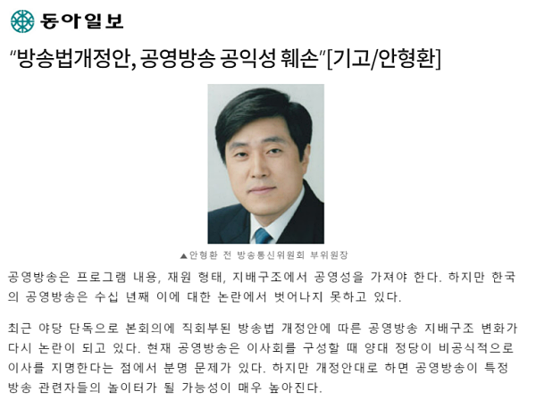 안 전 부위원장은 3일 동아일보에 기고한 <"방송법개정안, 공영방송 공익성 훼손">에서 "현재 공영방송은 이사회를 구성할 때 양대 정당이 비공식적으로 이사를 지명한다는 점에서 분명 문제가 있다"면서 "하지만 개정안대로 하면 공영방송이 특정 방송 관련자들의 놀이터가 될 가능성이 매우 높아진다"고 썼다.