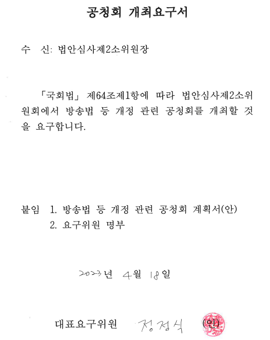 해당 공청회 개최 요구서에 따르면 19일 오후 2시 방송법 개정안에 대한 공청회가 법사위 법안2소위에서 열린다. 공청회 진술인은 2명으로 최철호 불공정방송감시단 대표(전 KBS PD), 오정환 전 MBC 보도본부장이 발제에 나선다.