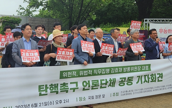 김동훈 한국기자협회장은 "공영방송의 근간을 흔드는 매우 엄중한 사안을 위원도 3명 뿐(정원 5명)인 합의제 기구가 무리하게 밀어붙이고 있다. 방송법 시행령은 상위법을 정면으로 거스르는 위법"이라며 "시행령 개정은 법개정이 안 되는 윤석열 정권의 전매특허가 되고 있다. 헌법이 국회에 부여한 입법권을 정면으로 침해한 김효재 직무대행은 국회에서 탄핵되어야 마땅하다"고 강조했다.