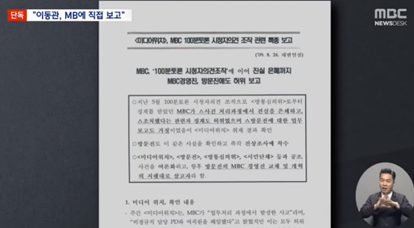 14일 MBC '뉴스데스크'는 <"이동관, MB에 'MBC 경영진 교체·개혁' 직접 보고">, <이동관 홍보수석실 문건 보니‥"청와대 비판하면 '문제보도'"> 등의 [단독] 보도를 내놓았다.