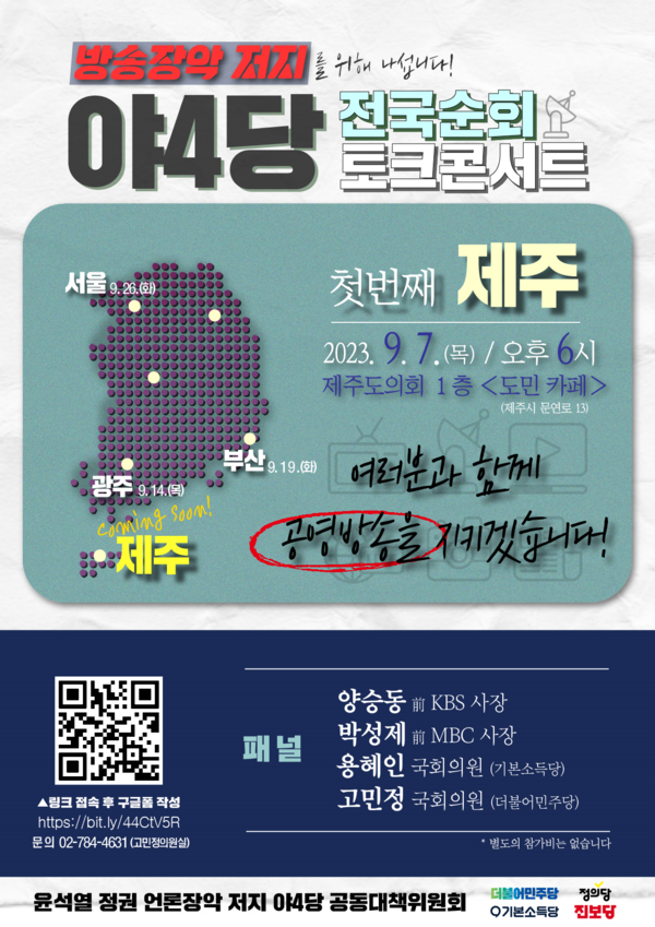 [미디어스=고성욱 기자] 더불어민주당, 정의당, 기본소득당, 진보당으로 구성된 윤석열정권 언론장악저지 야4당 공동대책위원회(이하 공대위)가 ‘방송장악 저지 전국순회 토크콘서트’를 개최한다. 첫 콘서트는 7일 제주도에서 열릴 예정이다.