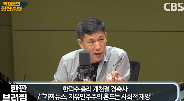 진 교수는 "한덕수 총리가 '가짜뉴스가 자유민주주의를 흔든다' 얘기한다. 아니다. 자유민주주의가 강한 이유는 '가짜뉴스'를 솎아낼 수 있는 시스템이 있기 때문"이라며 "진짜뉴스건 가짜뉴스건 허용이 되고, 그 가운데 범위 안에서 책임질 것은 책임지고 그렇지 않은 것은 걸러낼 수 있는 것"이라고 했다.