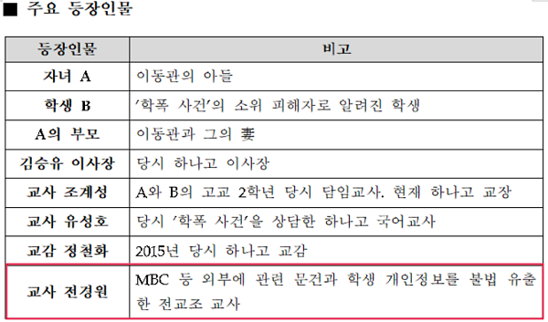 이동관 위원장은 대통령실 대외협력특보 시절 <'학폭 사건' 논란에 대한 입장>이라는 제목의 자료에서 전경원 교사에 대해 "MBC 등 외부에 관련 문건과 학생 개인정보를 불법 유출한 전교조 교사"라고 명시했다. 또 이동관 특보는 "2019년 12월 2일 MBC '스트레이트 하나고 의혹' 방송은 본인의 징계를 피하고자 학교 비리 의혹을 제기한 교사 전경원의 일방적이고 왜곡된 주장을 여과 없이 그대로 보도한 대표적인 악의적 프레임의 가짜뉴스"라고 했다. (관련기사▶TV조선 '공익제보자 허위보도' 진원지-확성기는 누구?)