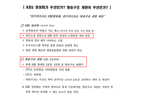 대외비 문건은 “단기적으로는 KBS정상화, 중기적으로는 방송구조 개편 예상”된다고 밝혔다. 문건은 “KBS 정상화(파괴적 혁신)” 세부 항목으로 ▲민주노총 언론노조 KBS본부 중심의 노영방송 체제 단절 ▲불공정 편파 왜곡 가짜뉴스 근절 ▲방만 경영 해소와 경영효율화를 위한 파괴적 혁신을 거론했다.
