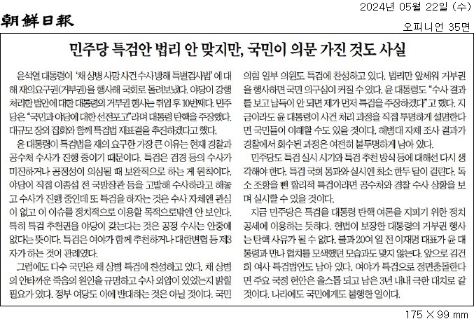 <윤 대통령이 채 상병 문제 국민에게 설명할 때다> 5월30일(목)