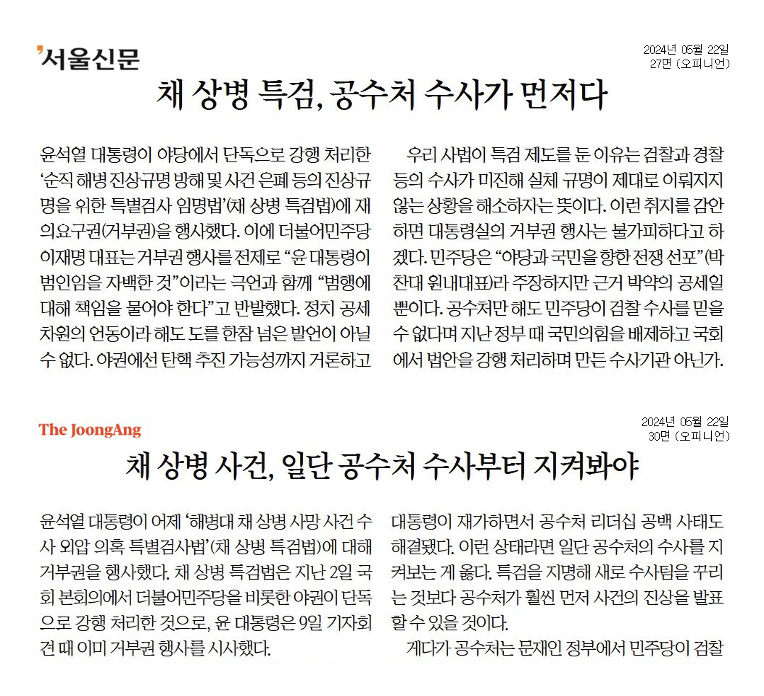 호반건설이 인수한 서울신문 5월 22일(수) 사설 <채 상병 특검, 공수처 수사가 먼저다>와 같은 날짜 중앙일보 사설 <채 상병 사건, 일단 공수처 수사부터 지켜봐야>는 전혀 이상하게 보이지 않는다. 거대한 지배구조에 함께 몸 담고 있는 족벌신문에 종사하는 기자(논설위원)들이 비슷한 속성을 보일 수밖에 없는 것이다.