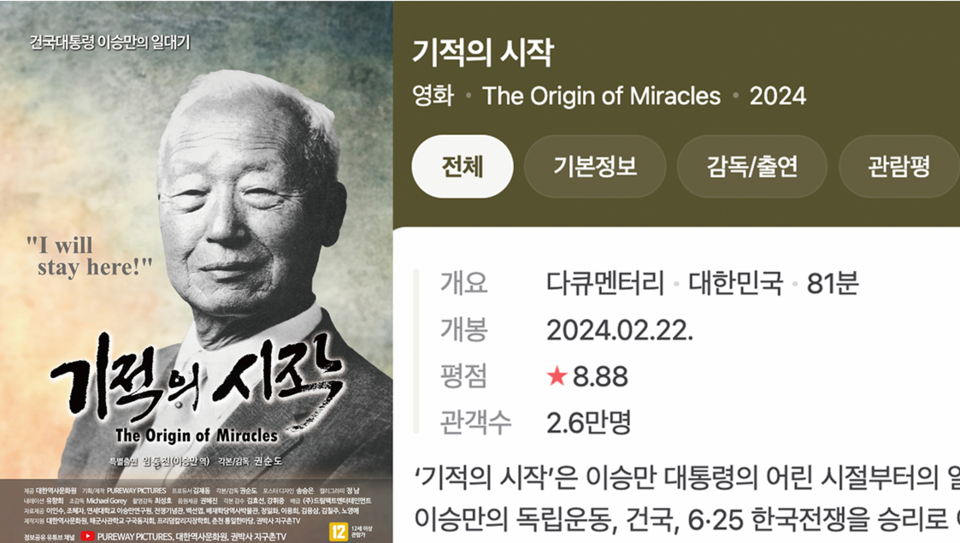 <기적의 시작>은 초대 대통령 이승만의 일대기를 다룬 저예산 다큐멘터리 영화다. 지난 2월 22일 개봉했으며 누적 관객수는 2만 6천 명에 불과하다. 전국언론노동조합 KBS본부에 따르면 <기적의 시작> 구매와 편성을 결정한 편성본부장은 질적인 면보다 의미로 가는 영화라고 방점을 찍었다.
