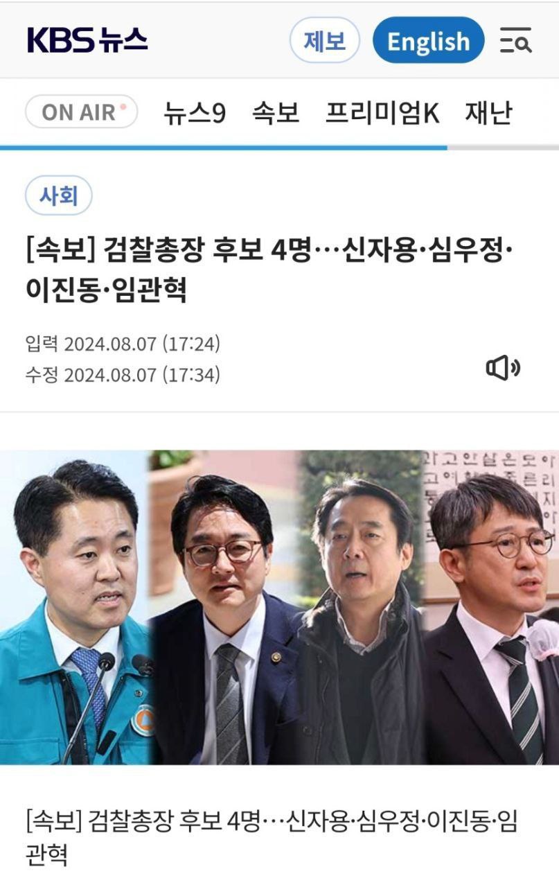 [미디어스=안현우 기자] 7일 차기 검찰총장 후보를 속보로 전한 KBS가 이진동 대구고검장의 사진을 이진동 뉴스버스 대표로 처리하는 촌극을 벌였다. 차기 검찰총장 후보 4인은 신자용 대검찰청 차장 검사, 심우정 법무부 차관, 이진동 대구고검장, 임관혁 서울고검장이다.