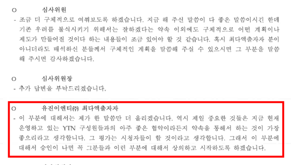 당초 유경선 회장은 ‘사장추천위원회’ ‘임면동의제’ 등 YTN의 기존 공정방송제도를 긍정적으로 평가했던 것으로 확인됐다. 지난 11월 24일 진행된 사업자 의견청취 속기록에 따르면 유 회장은 “현재 운영하고 있는 YTN 구성원들과의 협약이나 약속을 통해 하는 것이 가장 좋다고 생각한다”며 “그래서 이 부분에 대해 승인이 나면 꼭 그분들과 상의하고 시작할 것”이라고 말했다.