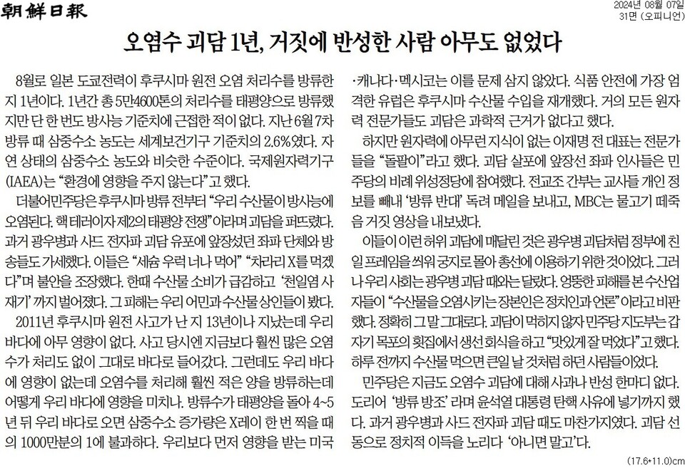 조선일보(이후, 조선)는 일본의 핵 오염수 방류 위험성을 경고하는 야당과 시민단체의 주장을 ‘괴담·음모론’으로 폄하했다. 조선은 또한 이재명 의원과 전교조 그리고 문화방송(MBC)을 괴담 유포자로 지목하면서, 정치적 이익(예: 총선 승리)을 위해 비과학적인 주장을 설파해 어민과 수산업자의 고통을 가중시켰다고 비난했다. 특히, 조선의 이 같은 논거들은 지난 8월 한 달 동안 보수신문·경제지의 주요 논거로 재활용됐고, 국론 분열을 가속화시켰고, 윤 정부의 반복되는 친일 행위을 옹호하는 방패 논거로 활용됐다. 조선의 이같은 행위는 국민의 생명권과 국가의 정체성 확립과 관련된 사안을 여야의 정쟁으로 축소 왜곡하면서 실체적 진실을 가린 파렴치한 여론 조작 행위이다.