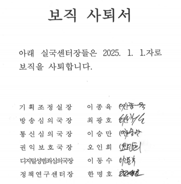 이종육 기획조정실장, 최광호 방송심의국장, 이승만 통신심의국장, 오인희 권익보호국장, 이동수 디지털성범죄심의국장, 한명호 정책연구센터장 등 6인은 다음 달 1월 1일자로 보직 사퇴서를 제출했다. 방통심의위는 국회의 예산 삭감에 대한 대응으로 100명가량의 직원이 이용하는 사무실 임대 계약을 해지하고, 인력 재배치를 추진하고 있어 직원들의 불만이 터져 나오고 있다.