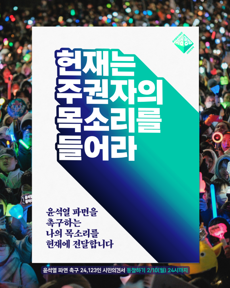 이날부터 2월 10일까지 3주 동안 시민의견서를 받아 헌법재판소에 제출, 주권자들의 목소리를 전달한다는 취지로 목표 인원은 24,123명이다. 위헌적인 비상계엄이 선포된 2024년 12월 3일을 기억하자는 의미다. 목표를 달성하더라도 조기 종료되는 일은 없다고 한다. 21일 오후 3시 현재 3,338명이 서명, 목표 대비 13%의 참여율을 나타냈다.
