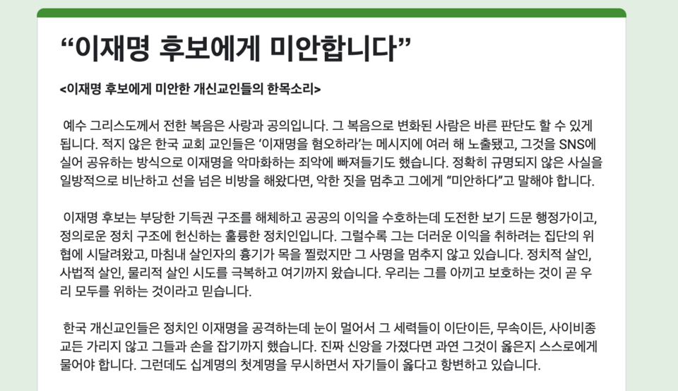 [미디어스=노하연 기자] 개신교인들이 이재명 더불어민주당 대선후보에 대해 미안하다는 내용의 성명을 발표했다.