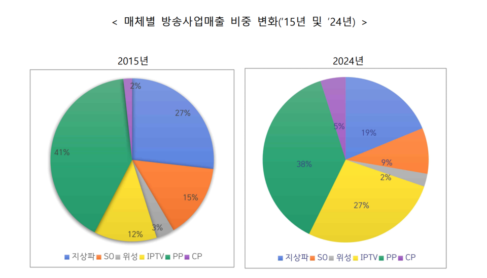 PP 광고 매출 역시 1조 2541억 원으로 전년 대비 7.8% 줄었다. IPTV는 12% 감소한 637억 원, 위성방송은 4.7% 감소한 262억 원이다. SO는 4.1% 증가한 1150억 원, CP는 15억 원을 기록했다.