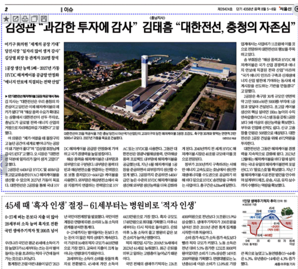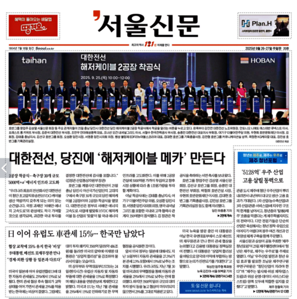 서울신문은 ▲대한전선은 2공장을 통해 국내 HVDC 해저케이블 공급망 안정화에 기여하고 국가 경쟁력을 높일 방침이다 ▲2040년 전 세계 HVDC 해저케이블 시장이 40조원 규모로 전망된다고 전했다.
