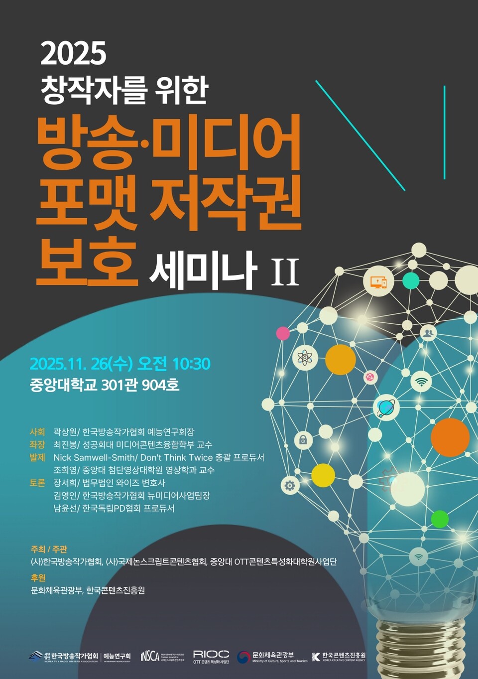 [미디어스=송창한 기자] 한국방송작가협회·국제논스크립트콘텐츠협회·중앙대OTT콘텐츠특성화사업단이 주최하는 방송·미디어 창작자 저작권 보호를 위한 세미나가 오는 26일 중앙대에서 개최된다. 문화체육관광부, 콘텐츠진흥원이 이번 세미나 후원을 맡았다.