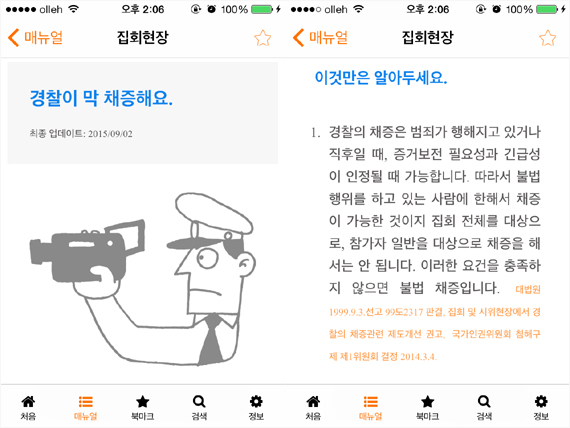 이 같은 상황에서 진보네트워크센터와 인권단체연석회의 공권력감시대응팀은 1일 <집회시위 제대로> 앱을 개발, 배포했다. 현재 iOS는 물론 안드로이드 모바일을 통해 무료로 해당 앱을 설치를 할 수 있다.